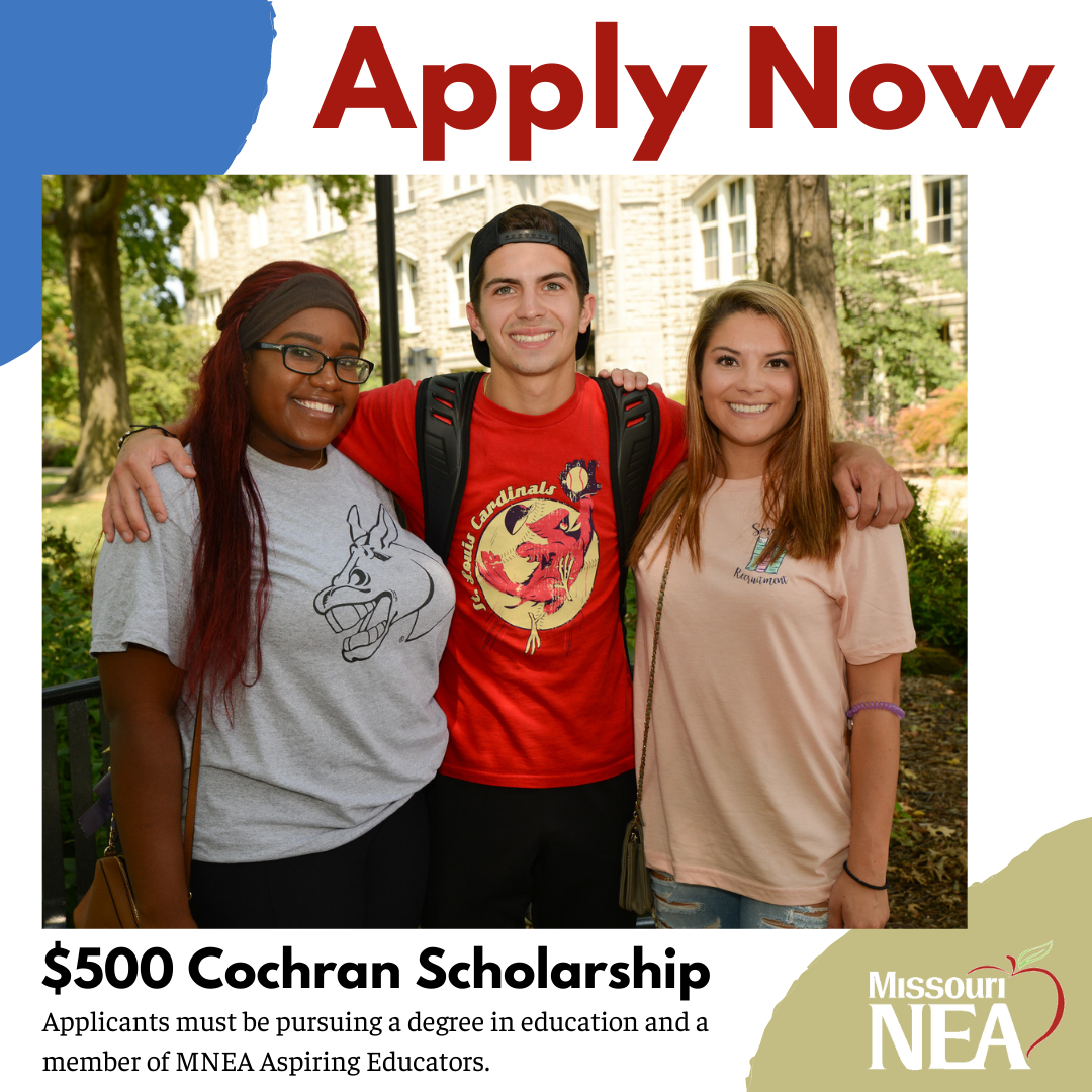 Eligibility: Applicants must be a member of Missouri NEA Aspiring Educators currently enrolled in a Missouri teacher education program and pursuing a career in teaching. Funds are for undergraduate work.
