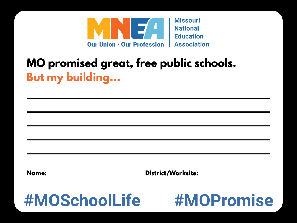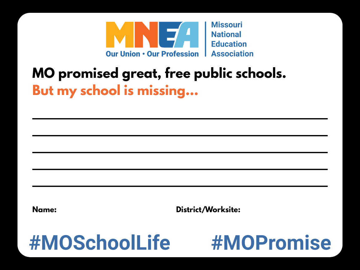 MO promised great, free public schools. Keeping Missouri’s promise starts with funding, respect for school workers, and assessments that don’t whittle down the purpose of a school to a letter grade.