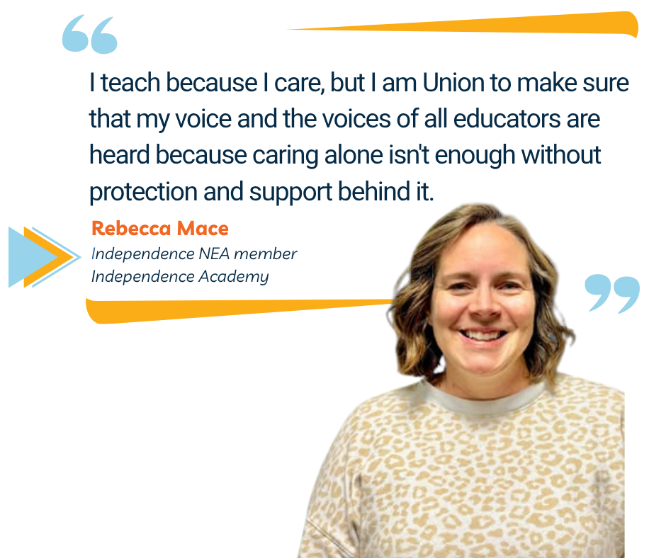 Rebecca Mace teaches library media at Independence Academy. She cares deeply about her students. But caring, she will tell you, is not enough. "I teach because I care, but I am Union to make sure that my voice and the voices of all educators are heard," Mace said, "because caring alone isn't enough without protection and support behind it."