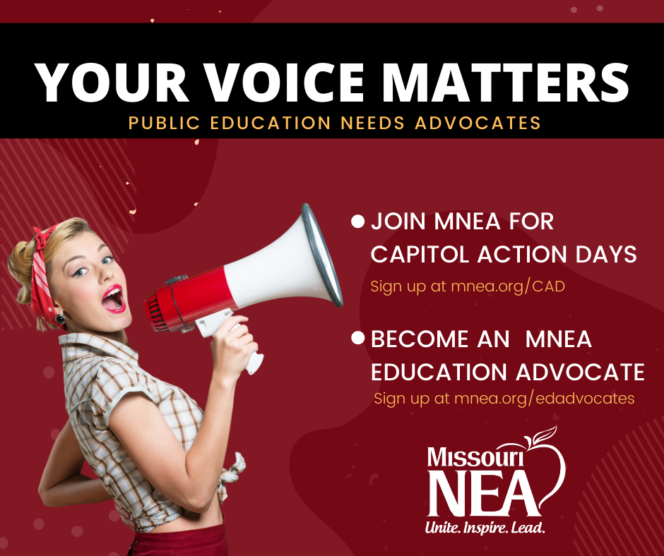 MNEA Legislative Director Otto Fajen summarizes floor debate and the latest information on the action in the Missouri legislature relating to MNEA's Resolutions and other bills of particular interest. You can receive the Legislative Update by email. All you have to do is subscribe.