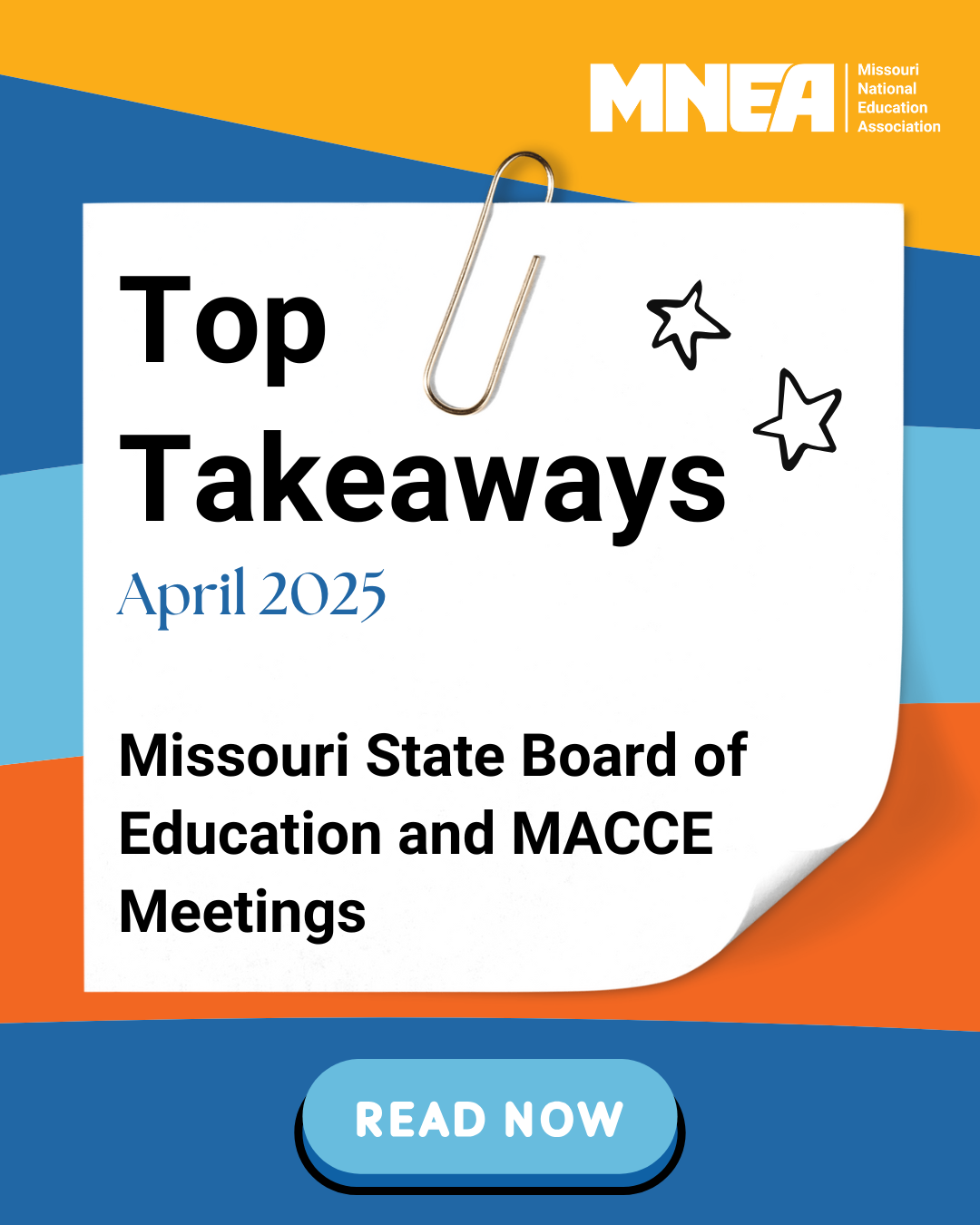 MNEA believes that every student and educator deserves the best experience possible in schools. That is why we are the only educational organization that is consistently present at every meeting of DESE, the state board of education, and the Missouri Legislature. We are your eyes and ears where decisions are being made about your schools.