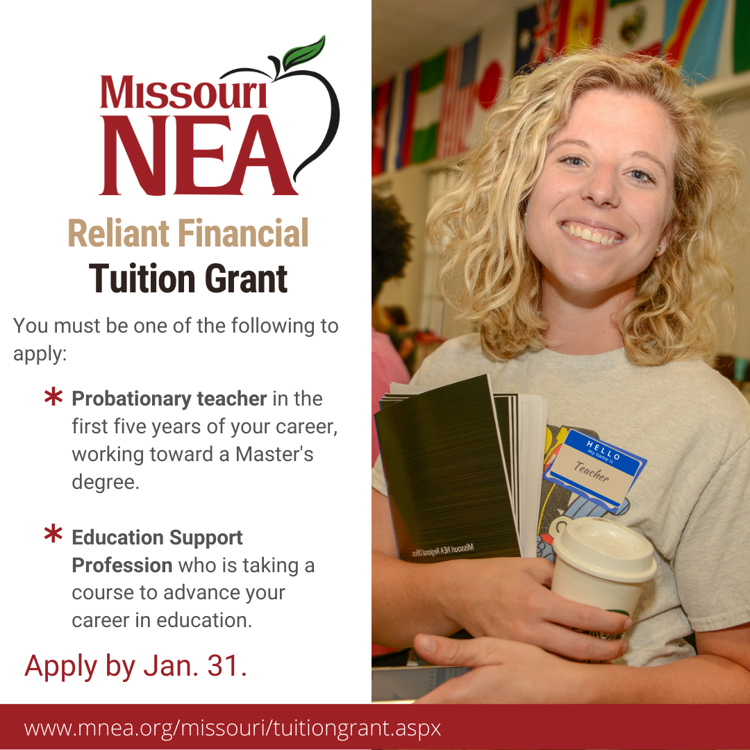 Missouri NEA can help. Thanks to funding from Reliant Financial Services, your MNEA membership means you are eligible to receive a $500 tuition grant toward the cost of a three-hour course. Members will have financial support as they strive toward academic growth and teaching excellence.